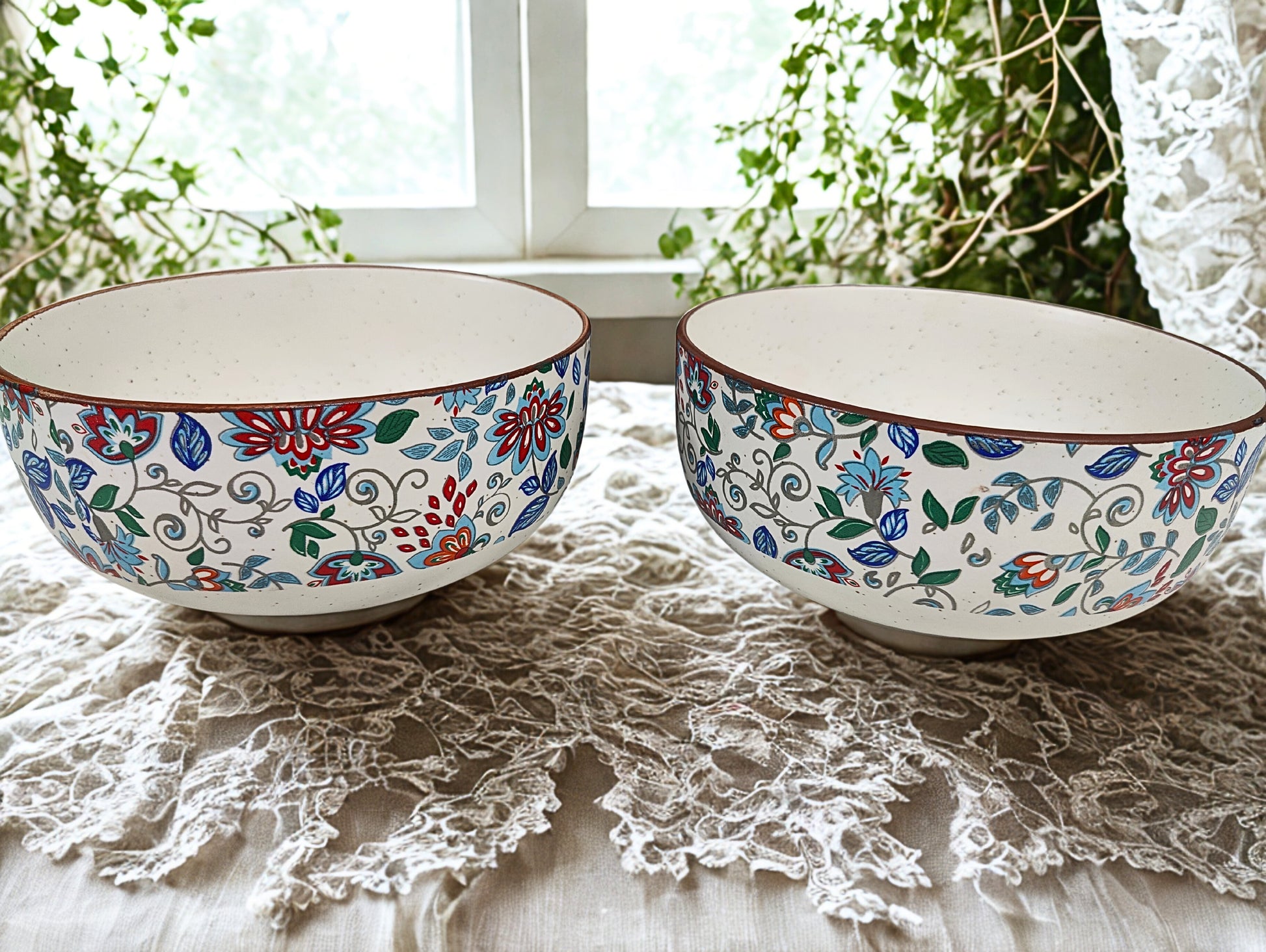 Two graceful serving bowls with stands, a delicate dessert stand, and versatile pasta or snack dishes come together in harmony—each piece adorned in blossoms that whisper timeless elegance.