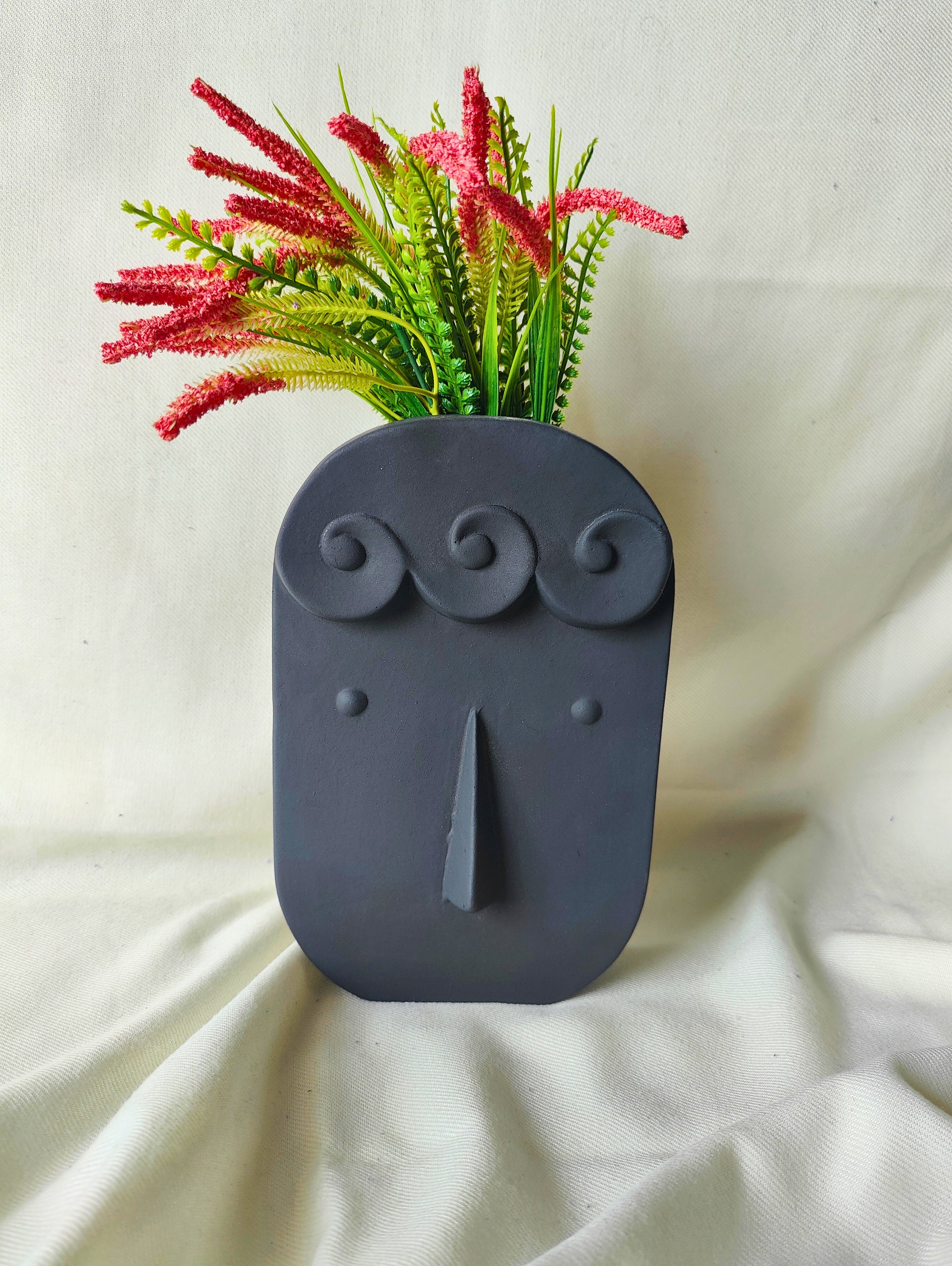 * 1 Black Vase with Artistic Face Illustration — a bold decorative statement.